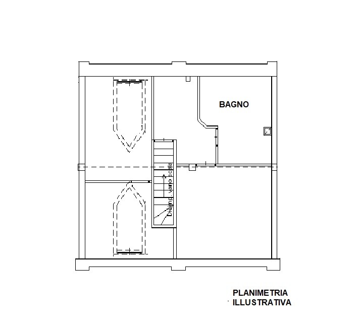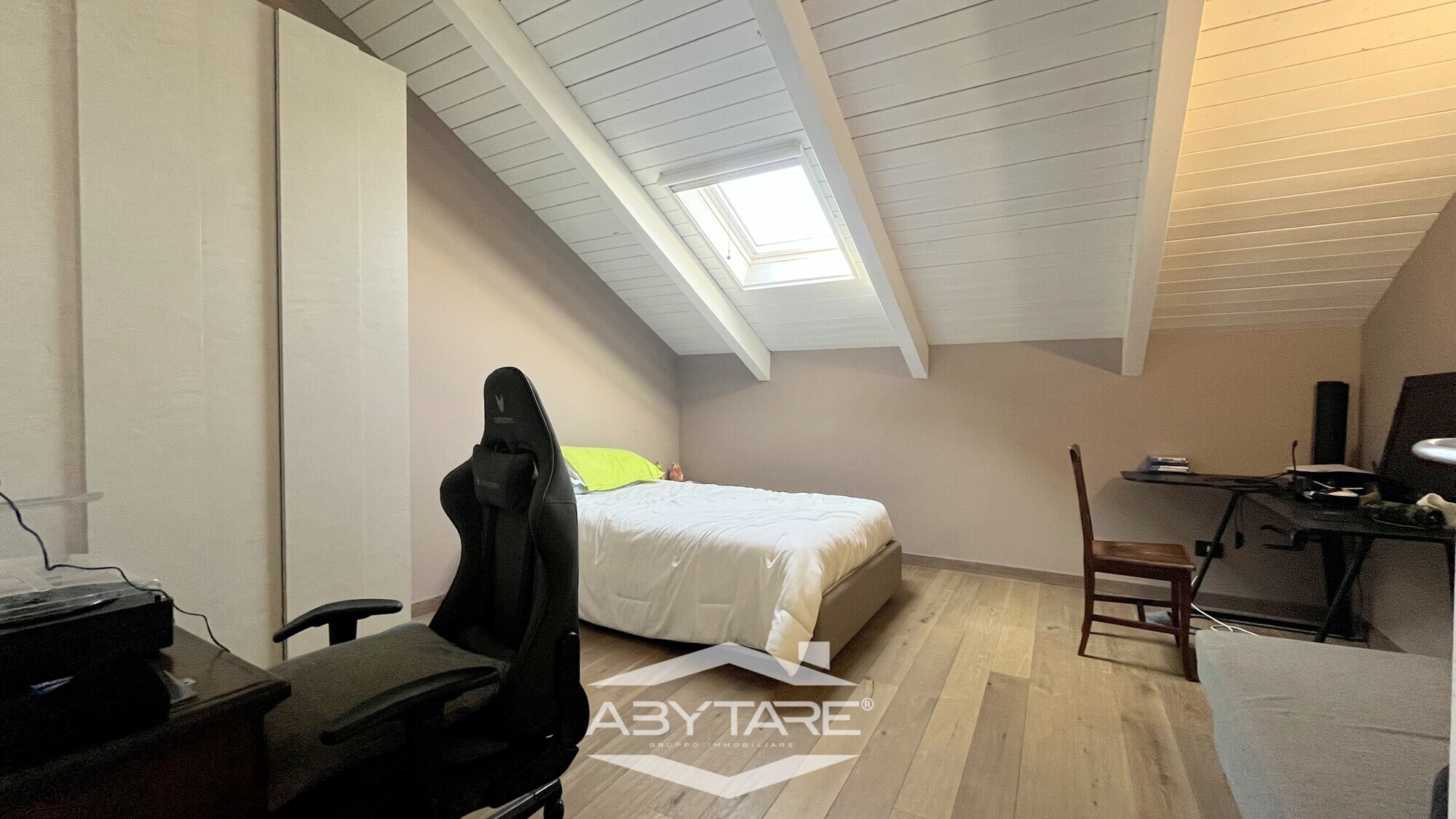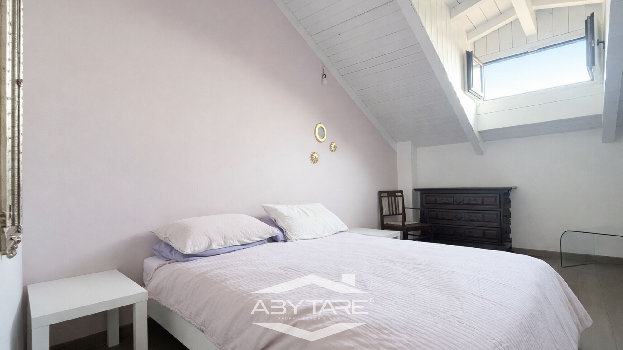 Salendo al piano mansardato si sviluppa una zona più intima e versatile,caratterizzata da travi in legno a vista e suggestivi abbaini, che ospita: