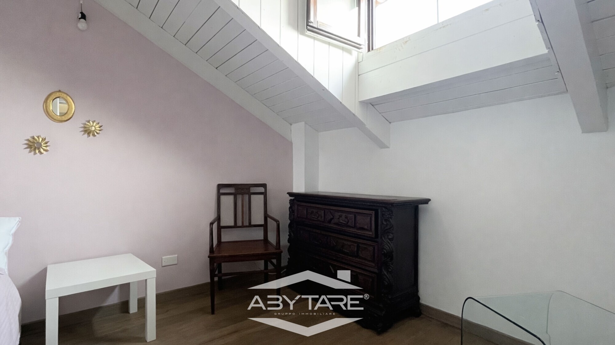 Salendo al piano mansardato si sviluppa una zona più intima e versatile,caratterizzata da travi in legno a vista e suggestivi abbaini, che ospita: